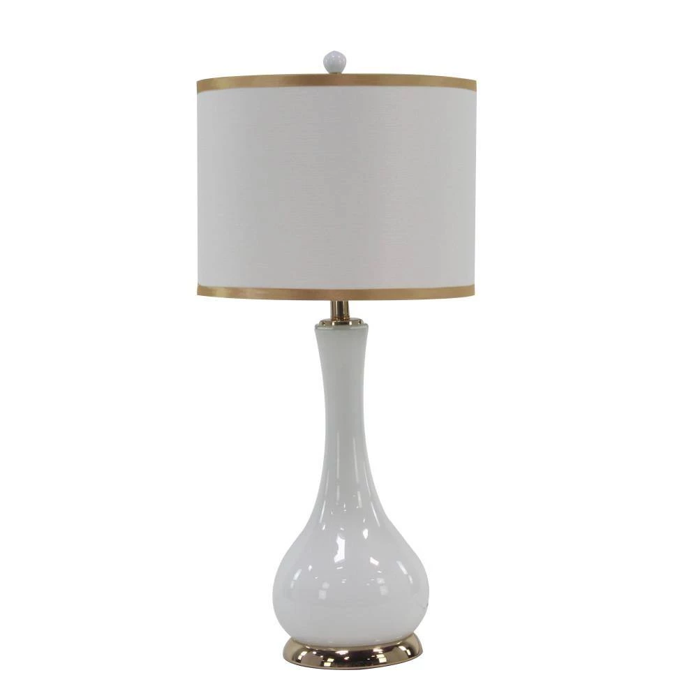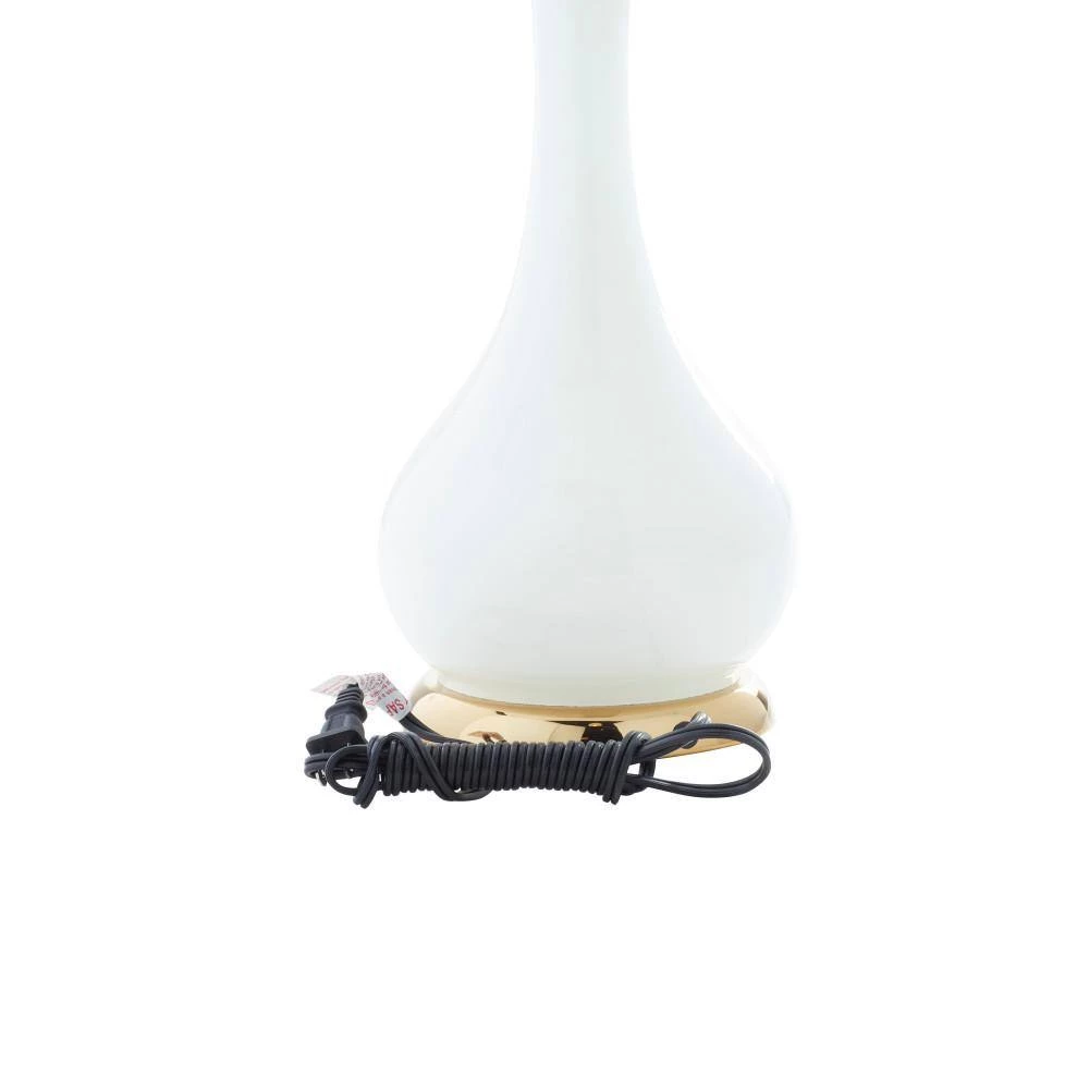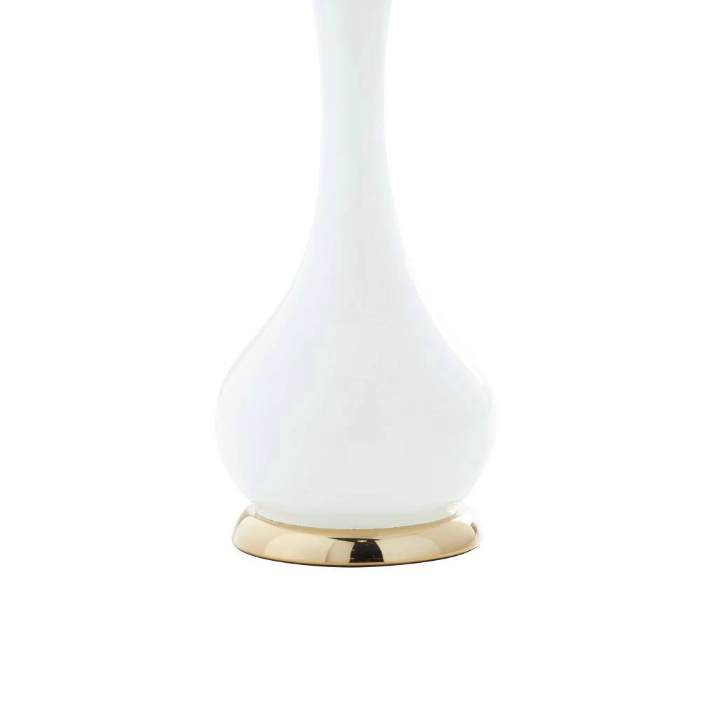 - Features a gold-finished iron post and a white glass long necked gourd body on a gold-finished round iron base
