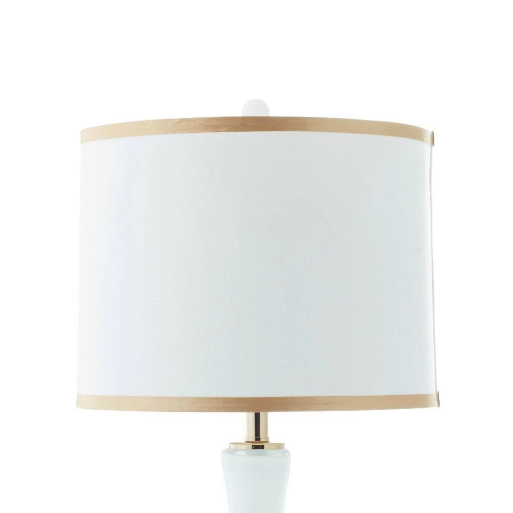 - Designed with a white linen drum shade with gold-finished top and bottom trim