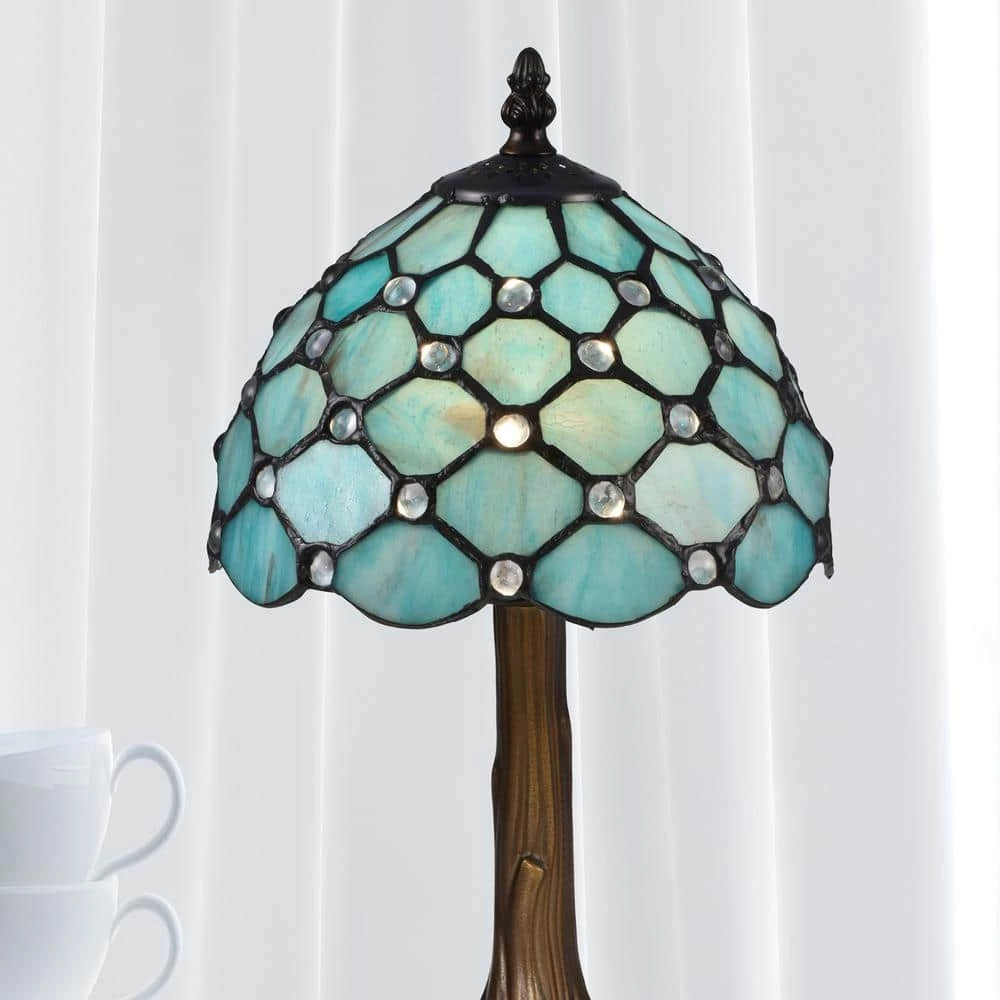The tranquil tone of our Castle Point Table Lamp is a harmonious addition to any decor style. The dome shade is handcrafted of diamond shaped art glass pieces in soothing light turquoise. Each piece is bordered with bold filigree. Clear art glass gems are set at the intersections of the filigree to create a quilted pattern that will glow gently with bright pops of sparkle when the lamp is illuminated. We paired Castle Point with a tree trunk base that is finished in Antique Bronze and topped it with a matching cut out vase cap and flame finial, which gives the lamp its overall treelike appearance. A very pretty choice wherever you choose to display it, our Castle Point Table Lamp will provide your family with many years of artistically reliable lighting.