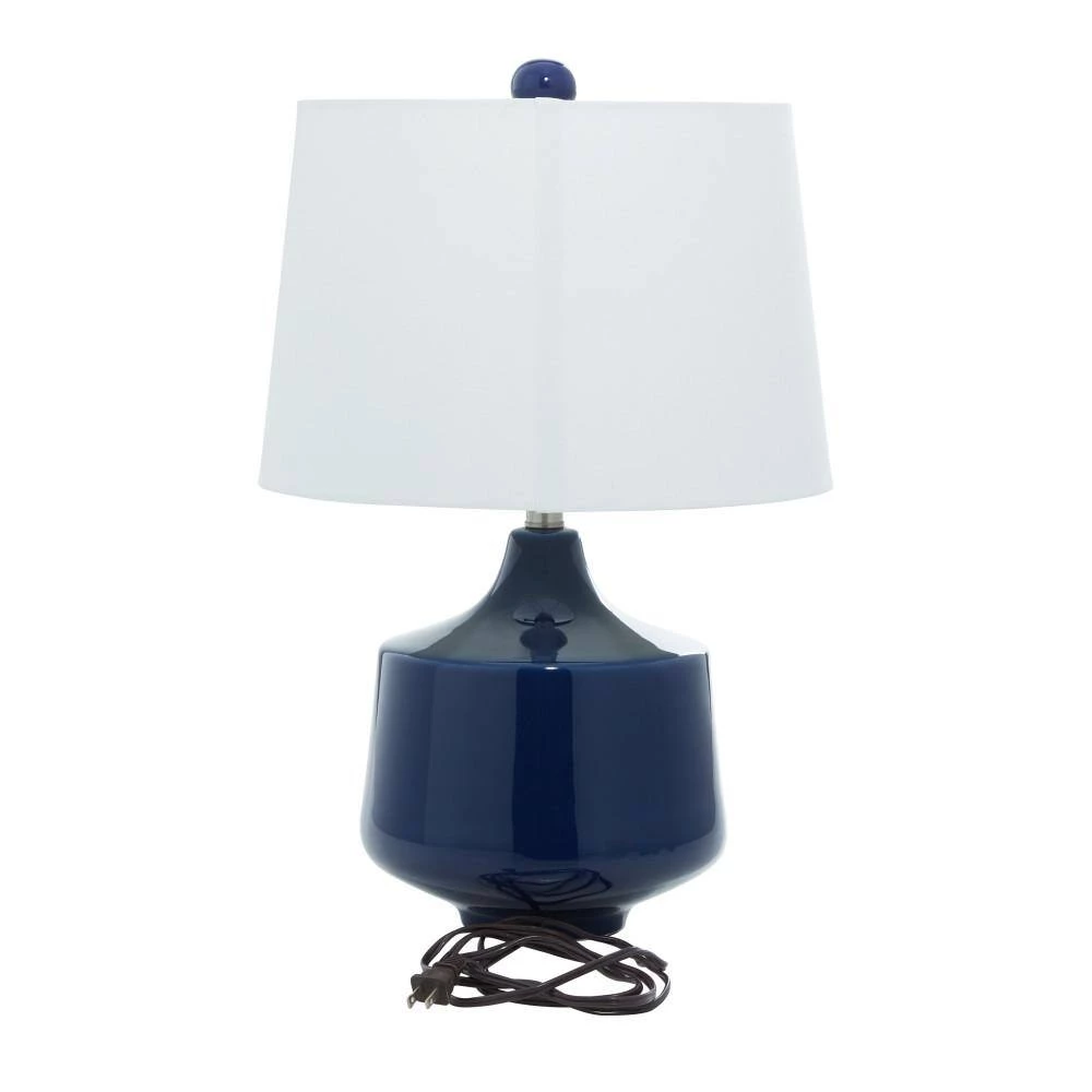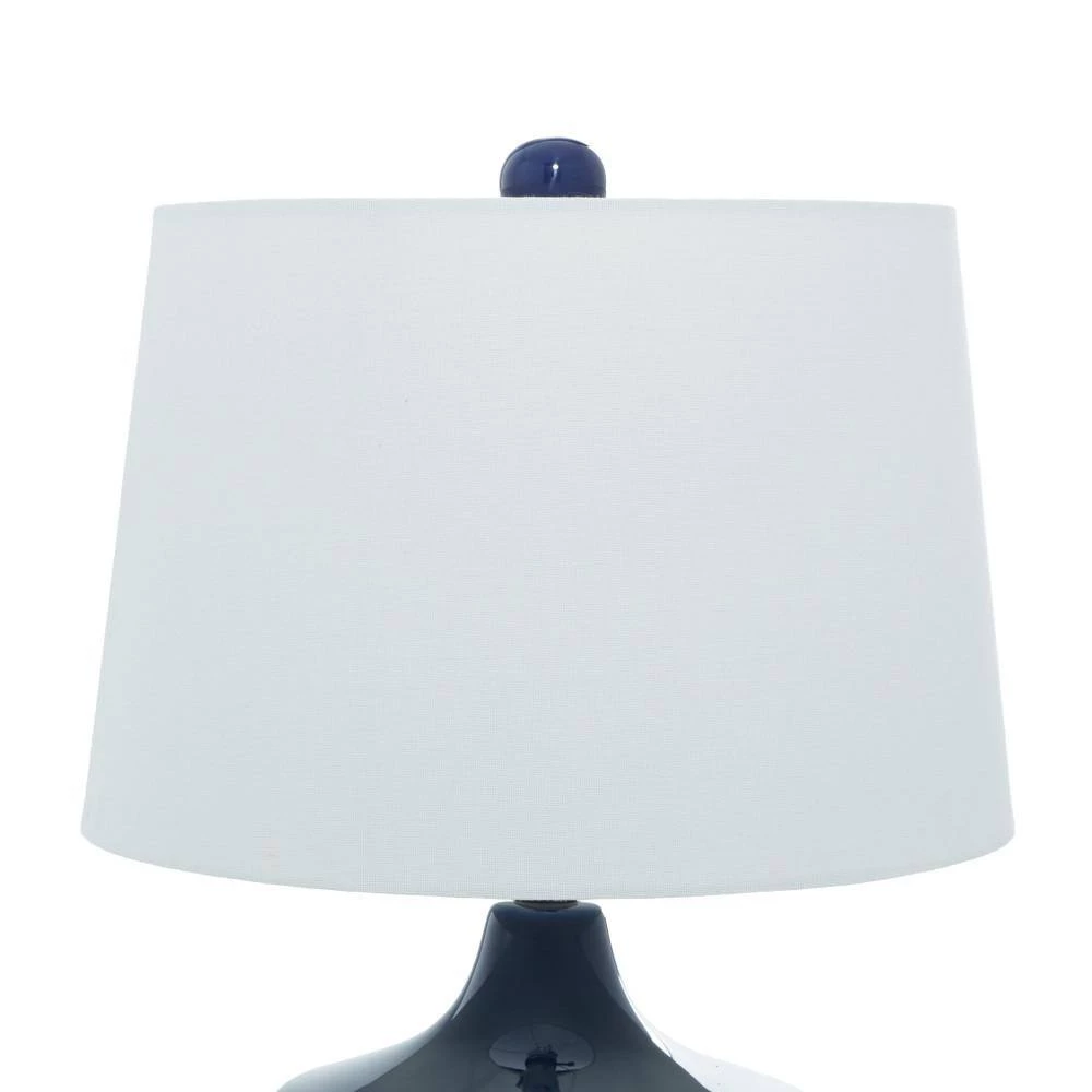 Lighting elevates any home, creating and enhancing the ambiance of any living space. This table lamp is no exception. The accent lamp, with its porcelain trapezoid body in a smooth blue finish, complements most home interiors. Completing the stylish look is a white linen drum shade. Place on a side table to illuminate a traditional or contemporary style home. Uses a 40-watt bulb (not included). Cord length measures 73″. Suitable for indoor use only. A drum shaped shade made of linen. Easy on/off twist switch under the shades. This item comes shipped in one carton. Traditional style. This items comes as a set of 2.