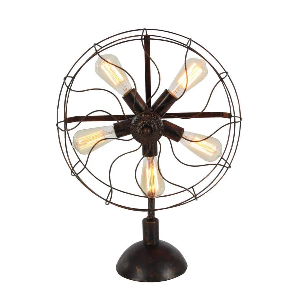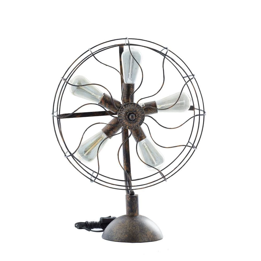- An industrial accent lamp features five bulbs and a round, open-cage design to mimic the appearance of a traditional fan