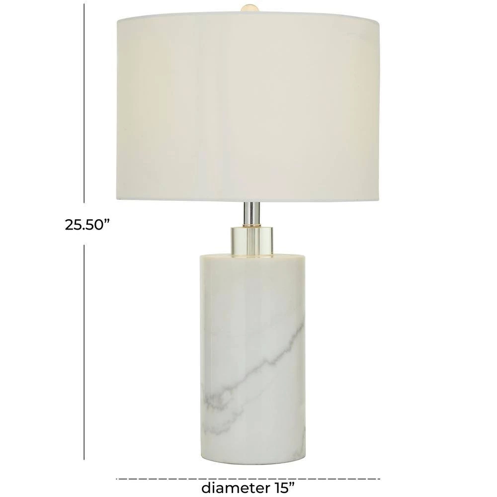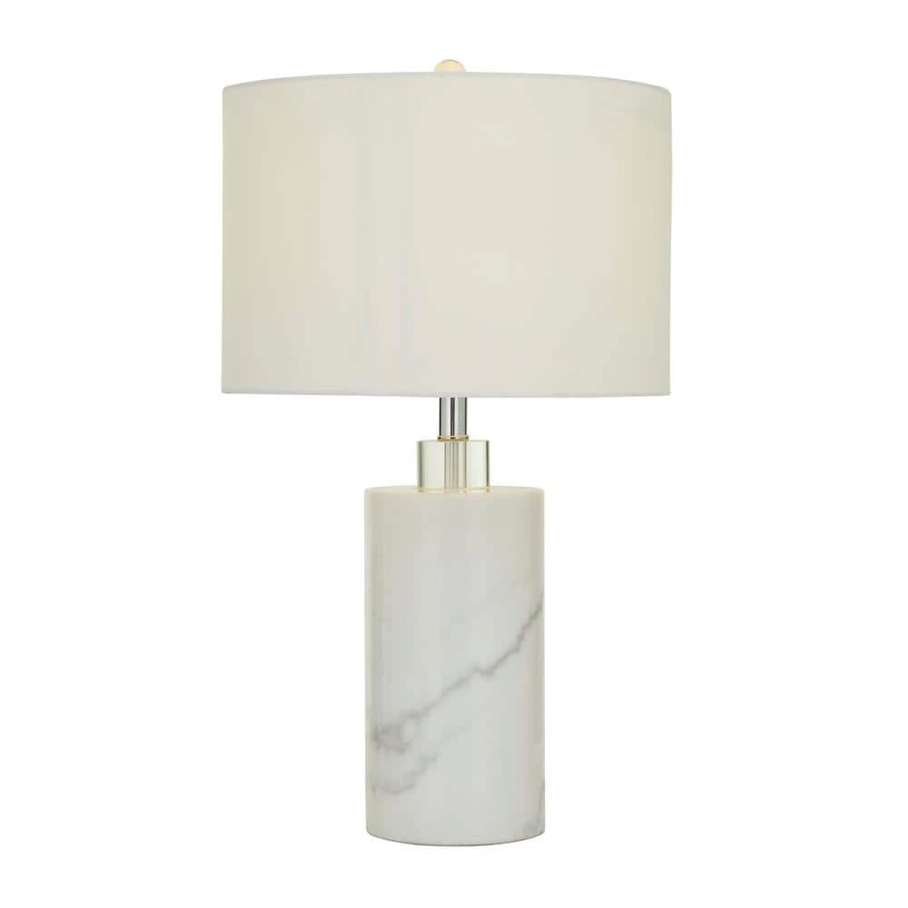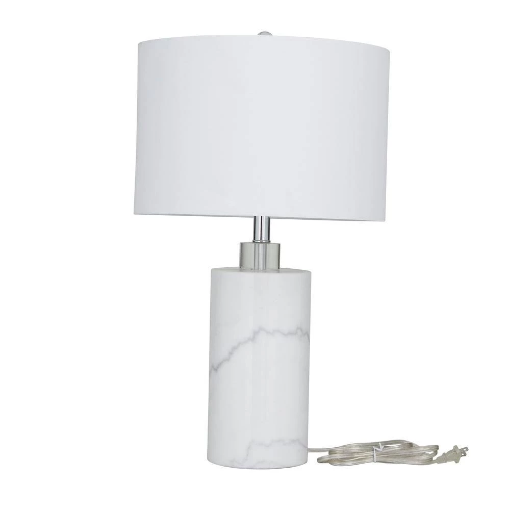 - Modern table lamp carries white marble body with stainless steel detail that complements the white cotton drum shade for sophisticated display