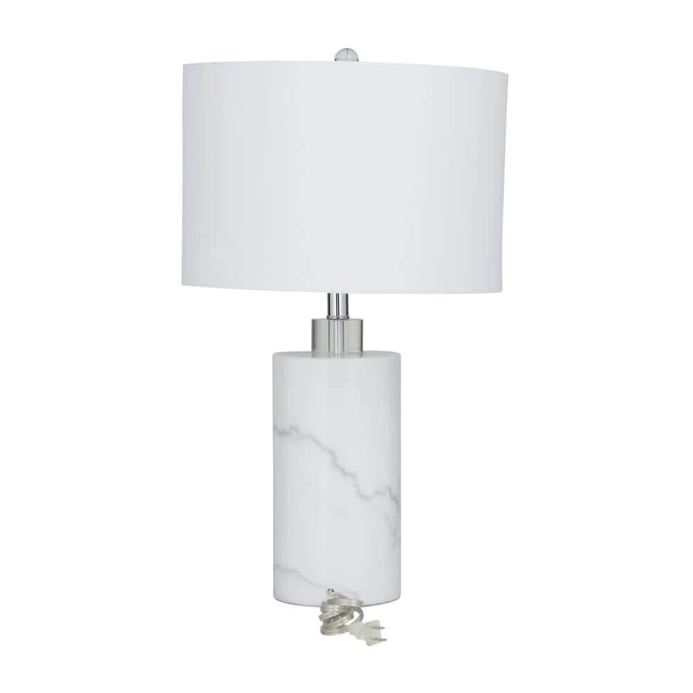 - Round accent table lamp features white marble finish with bright white shade and clear crystal accent