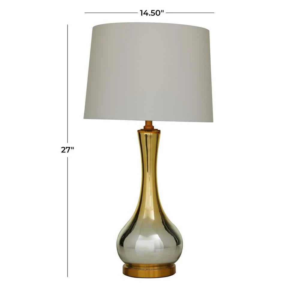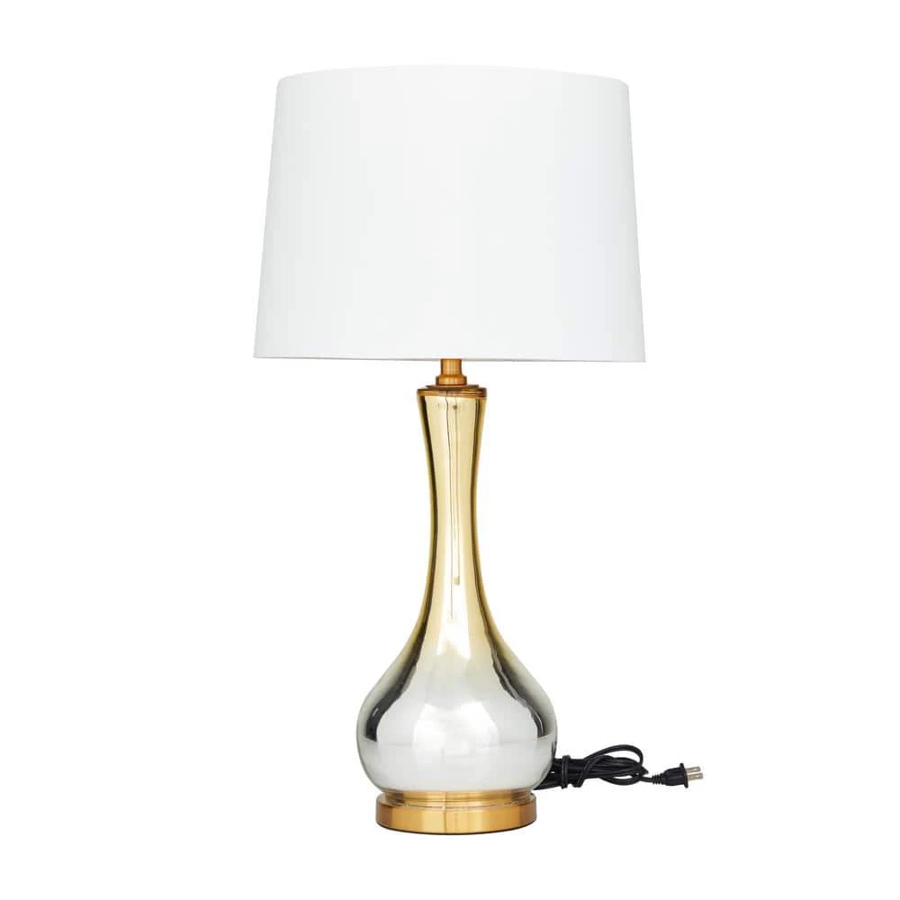 - Gold and silver gradient highlights this accent lamp with white shade