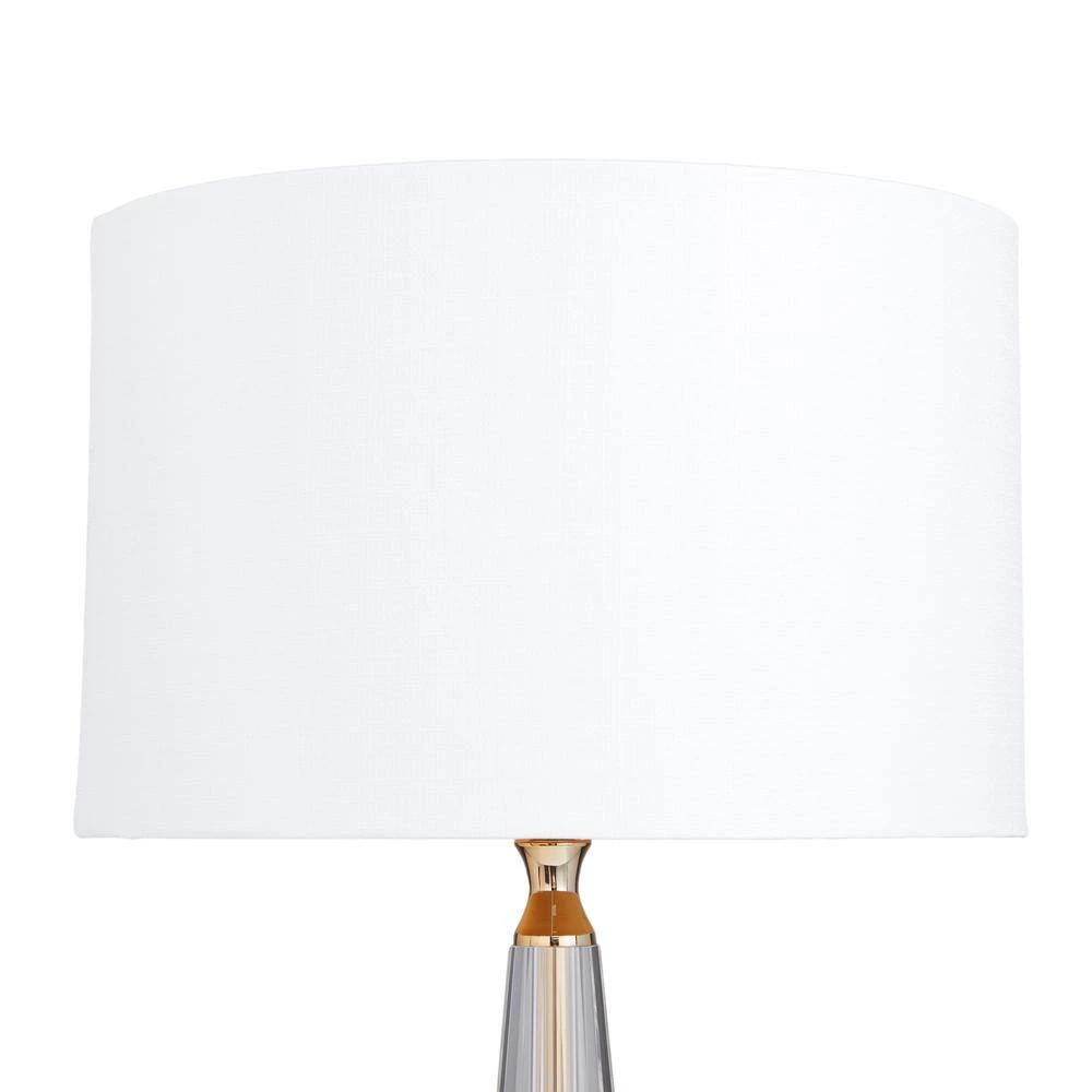 - This table lamp highlights a bleached white drum shade with crystal and metallic gold accent finish