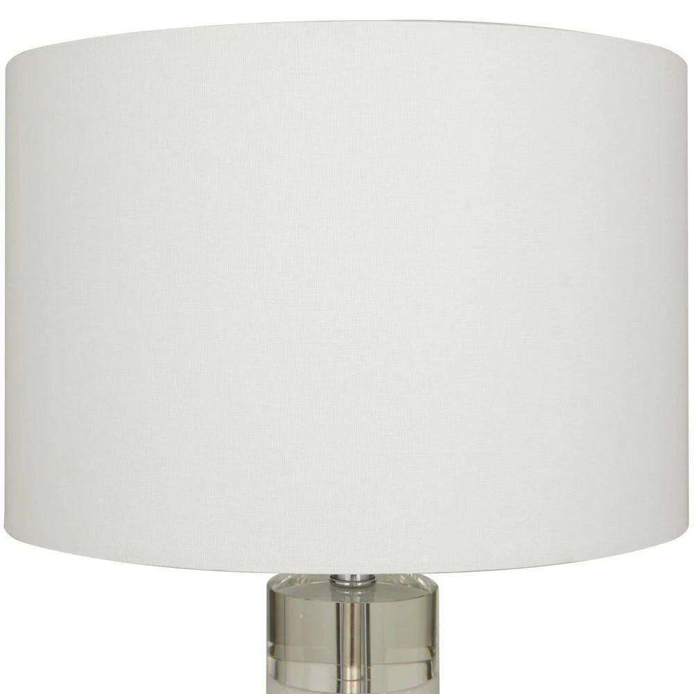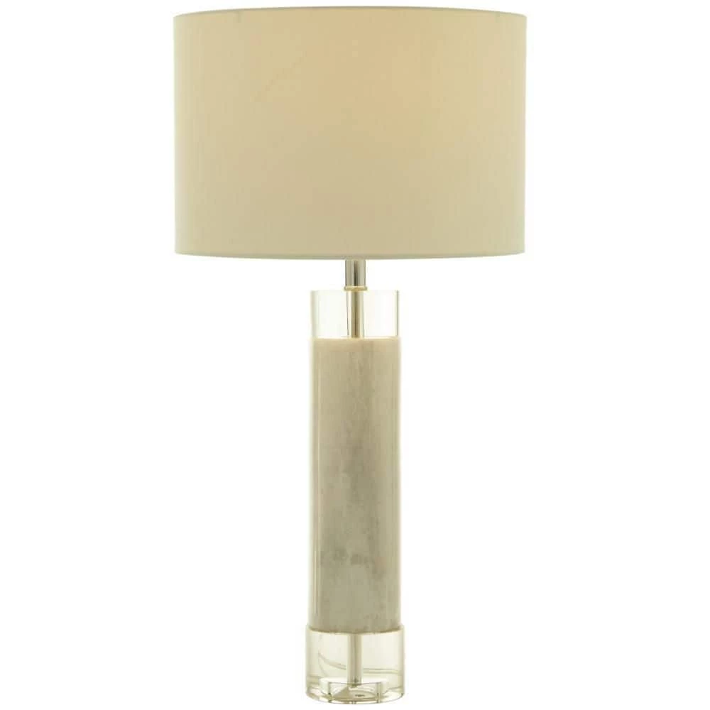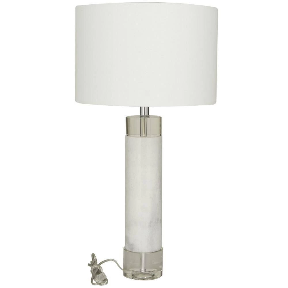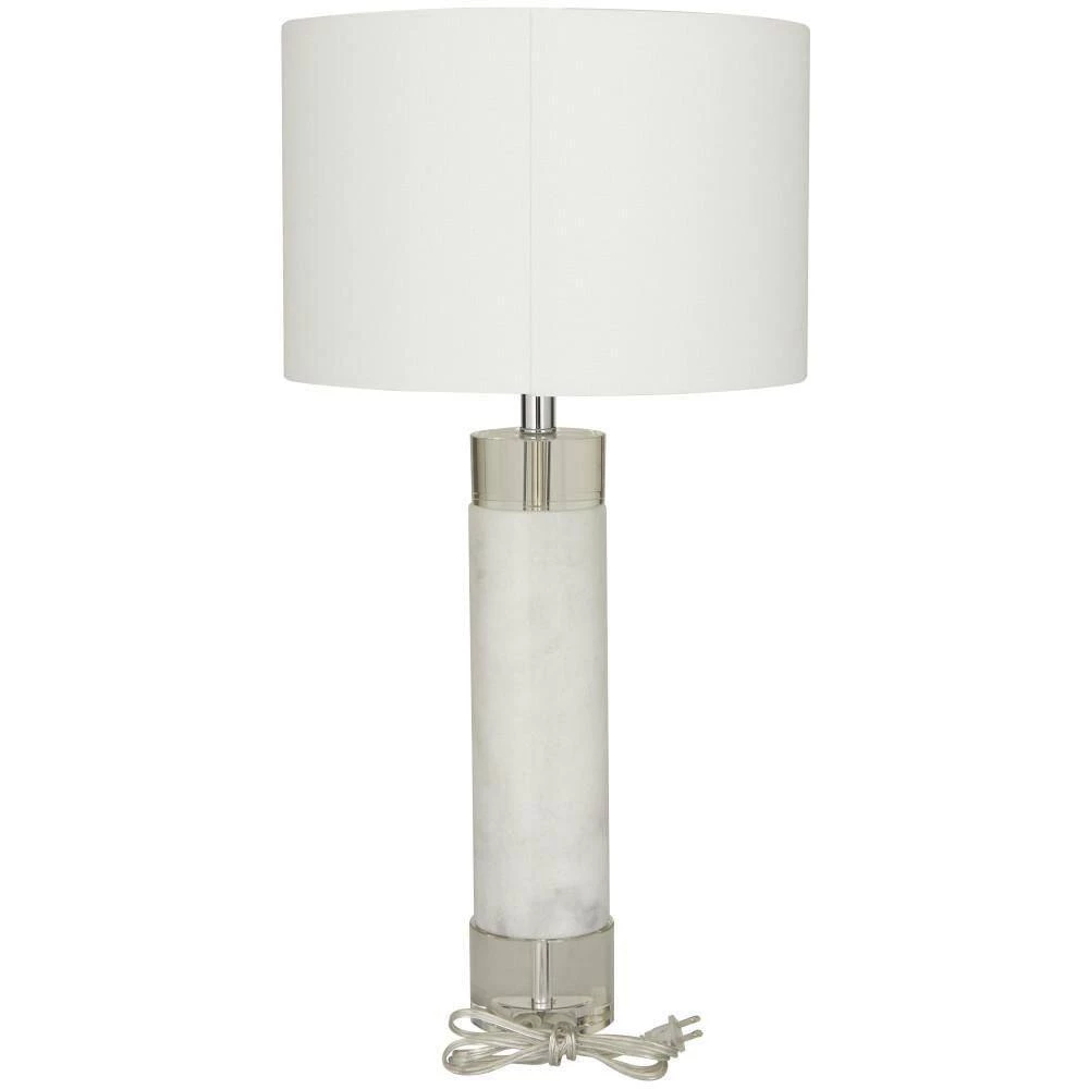 - Modern table lamp carries white marble body and clear acrylic accents that complements the white cotton drum shade for sophisticated display