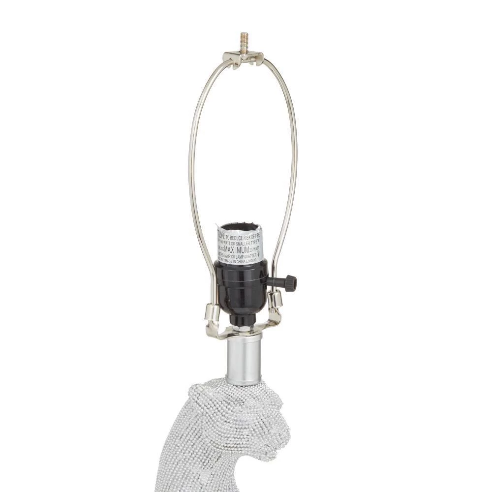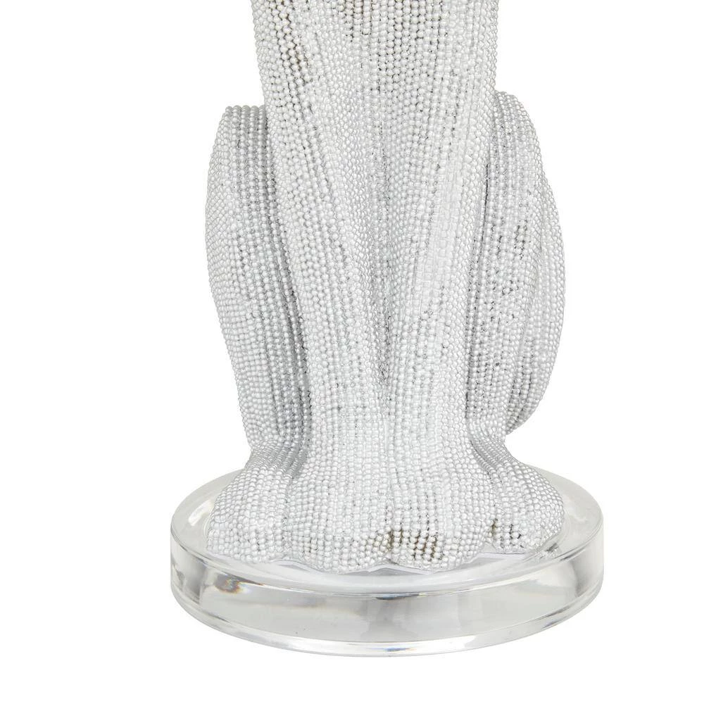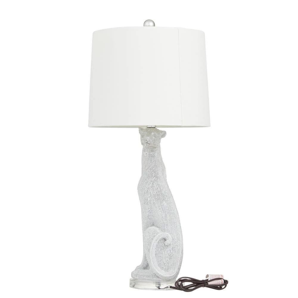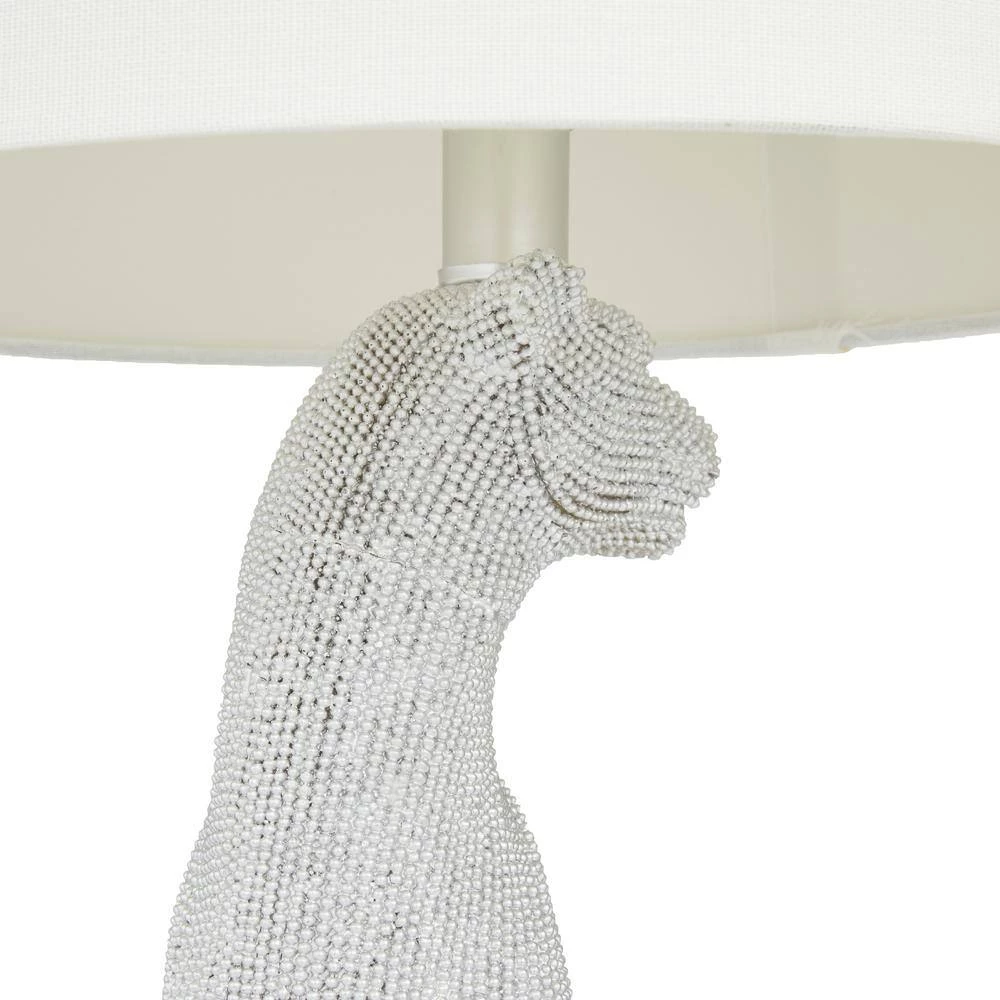 - This decorative table lamp highlights white shade, white leopard body, and smooth transparent base