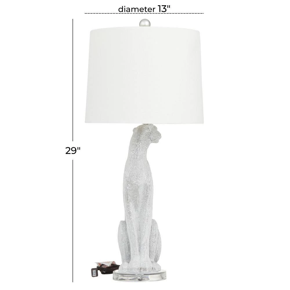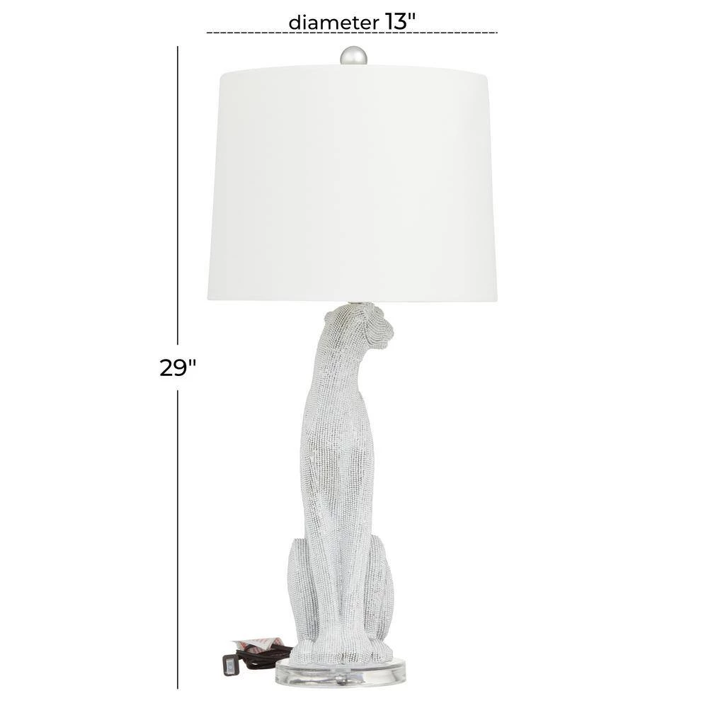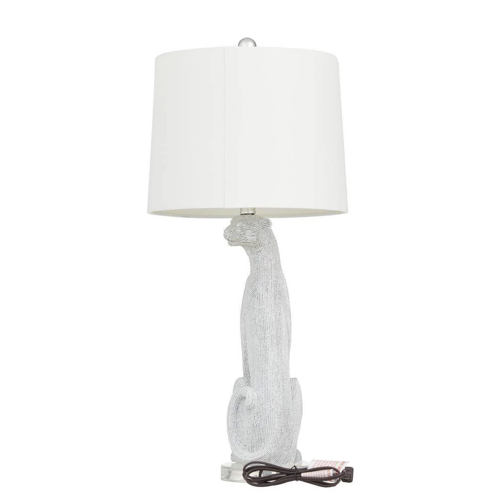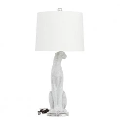 A white leopard table lamp that brings charm and elegant look that glows with decorative inspiration to give any room an instant decor upgrade. This eye catching lamp makes a playful addition to your surface space and beautifully illuminate its surrounding area. Make a statement with this unique lamp on mantle, console table or in any living space. Requires 1 Standard Type A bulb, not included. This item comes shipped in one carton. The shade of this table lamp is securely mounted on the leopard-inspired base. Suitable for indoor use only. This accent piece features a linen white drum-shaped lampshade. Set comes with 2 lamps. Comes with an On/Off switch. Glam inspired. The cord is 57 inches.
