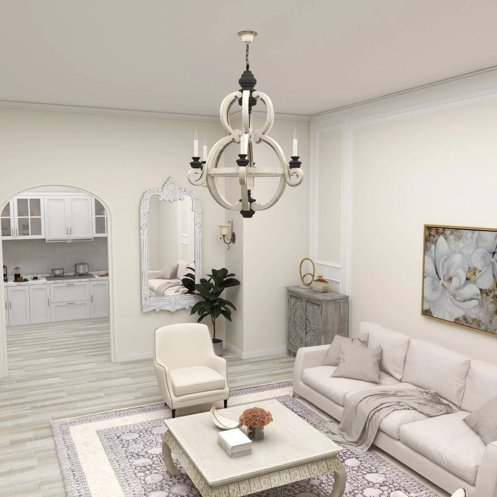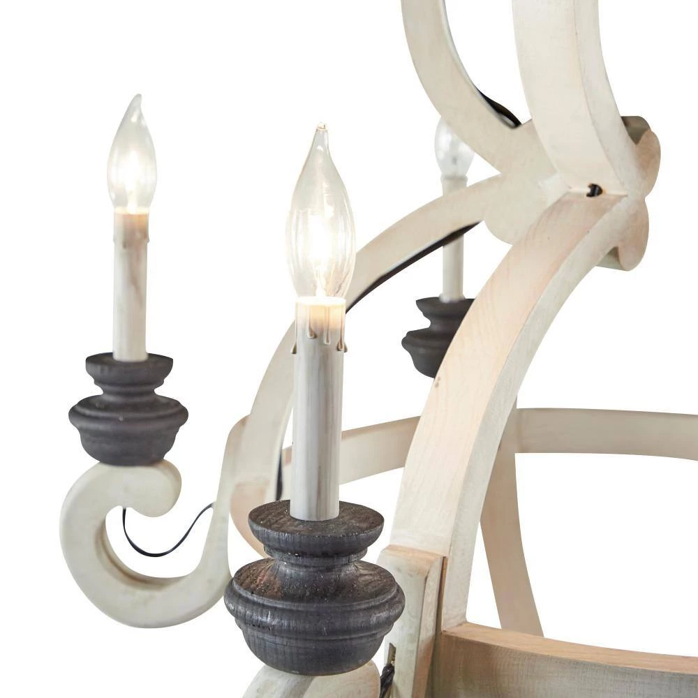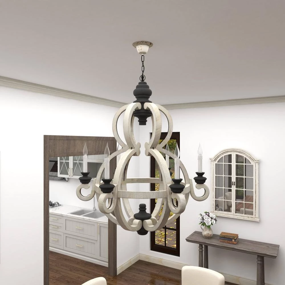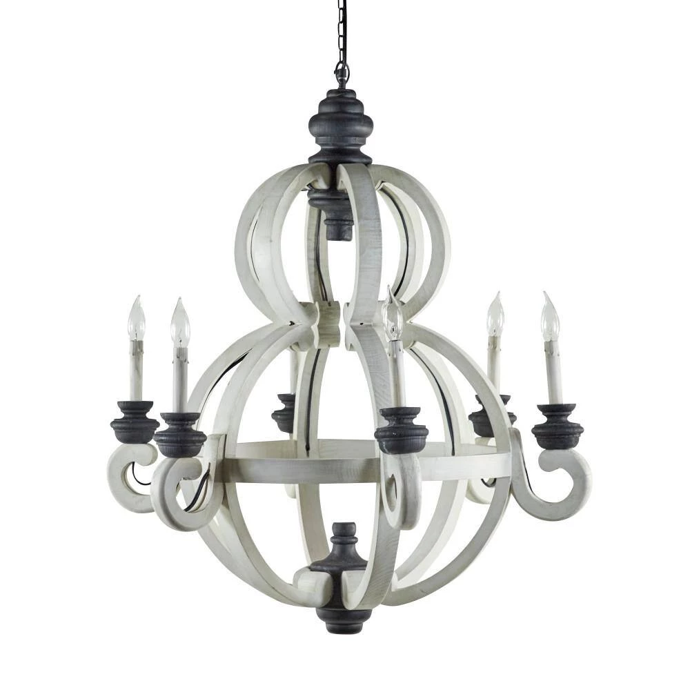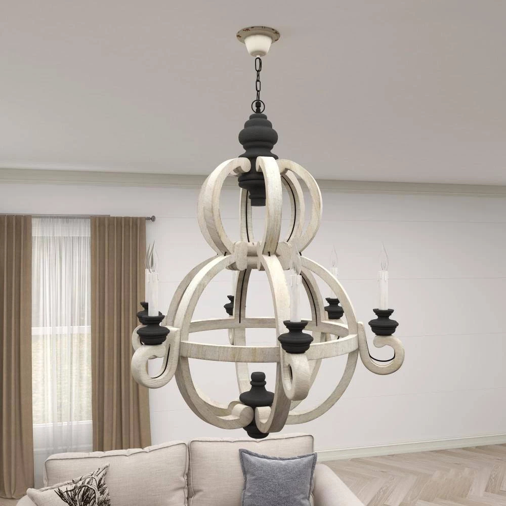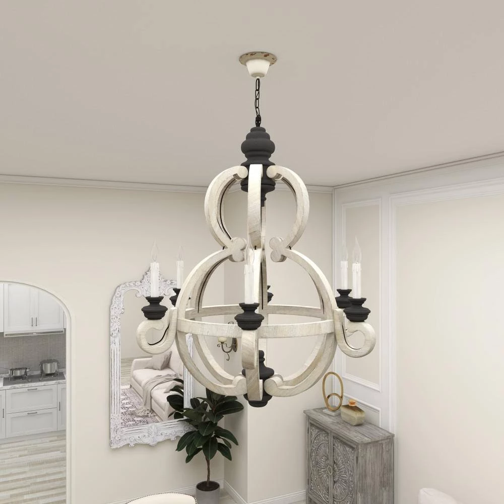 This Chinese red pine made chandelier takes a gridded globe like shape to carry six classic candelabra style light bulb holders. Its overall exterior was made in India and was given a black and white finish to suit antique, cottage chic, and rustic themed interiors. Use it to lighting decoration in foyers, dining halls, bars, porches, and hallways. LED screw base candelabra. Electric chandelier with hardwired canopy and hanging chain. Suitable for indoor use only. This item comes shipped in one carton.