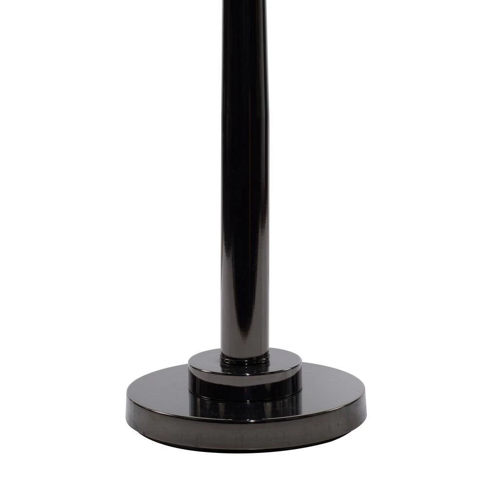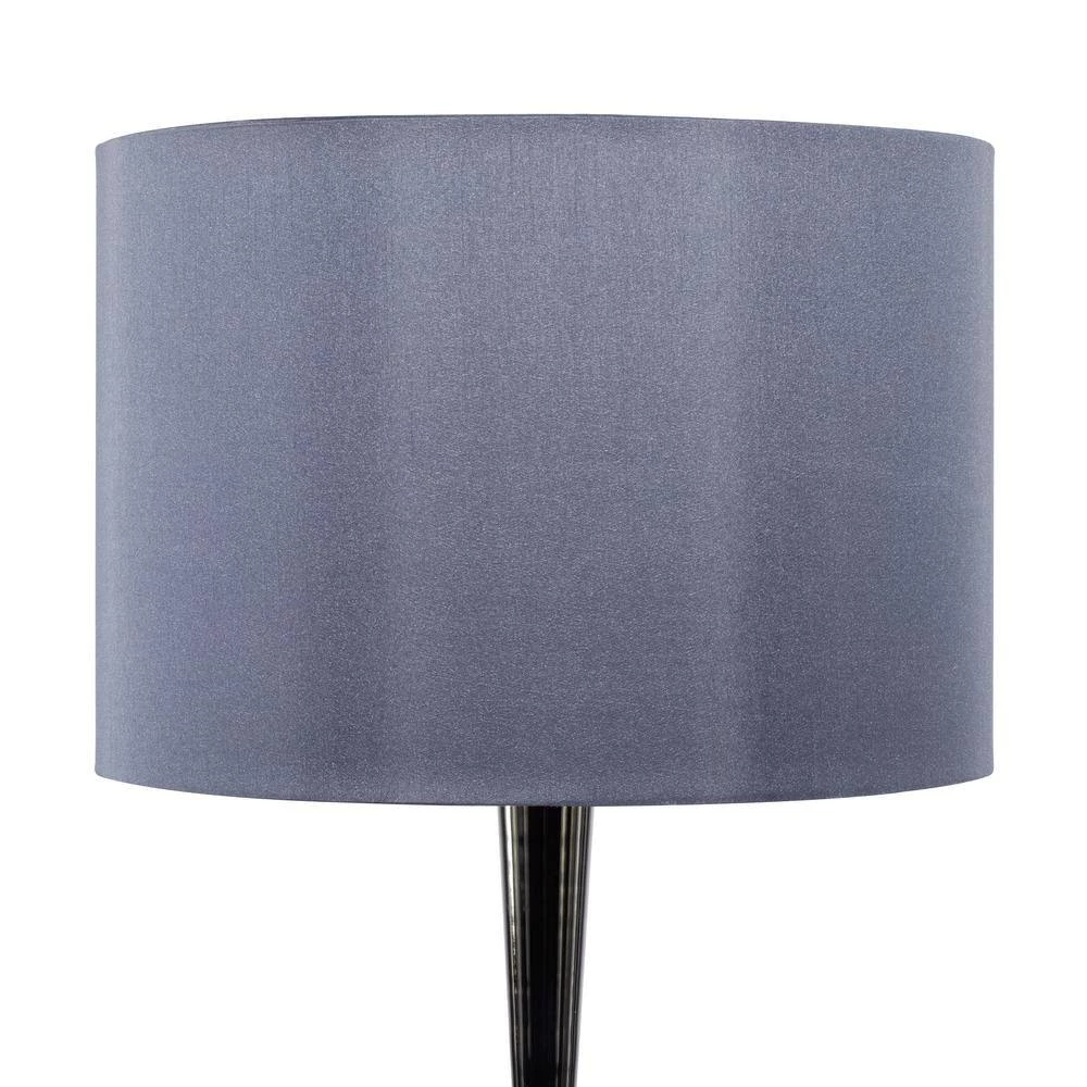 - A polished gunmetal gray lamp with a bluish-gray lamp shade