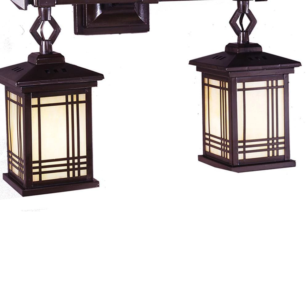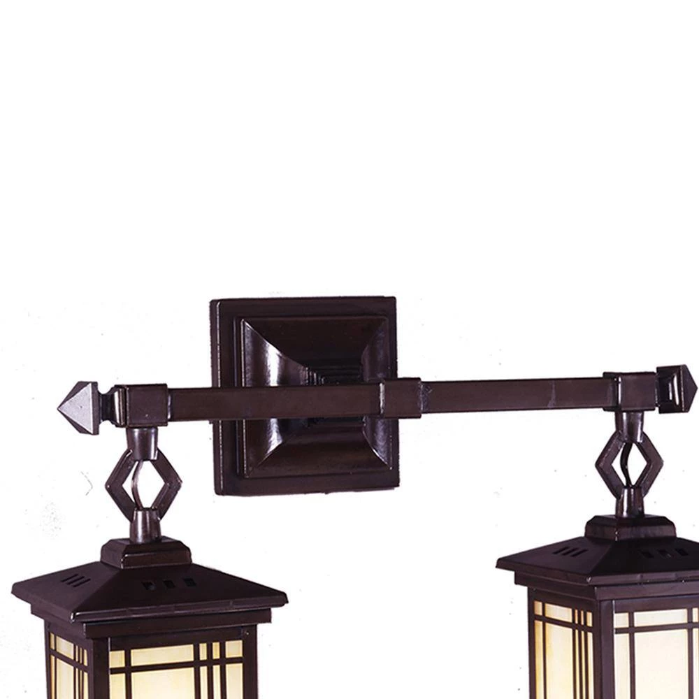 Our designers have modernized the classic mission style light fixture in the Avery wall lantern. 2 sq. lanterns hang from a bold metal horizontal rod and canopy, all finished in antique bronze. Each sq. shade features bright white art glass panels with mission style filigree overlay, also finished in antique bronze. A wonderful choice for a foyer, Avery also makes a unique hallway fixture. With its classic style and neutral color, Avery will assimilate well into any decor style and will add a distinctive decorator touch to your home for many years to come.