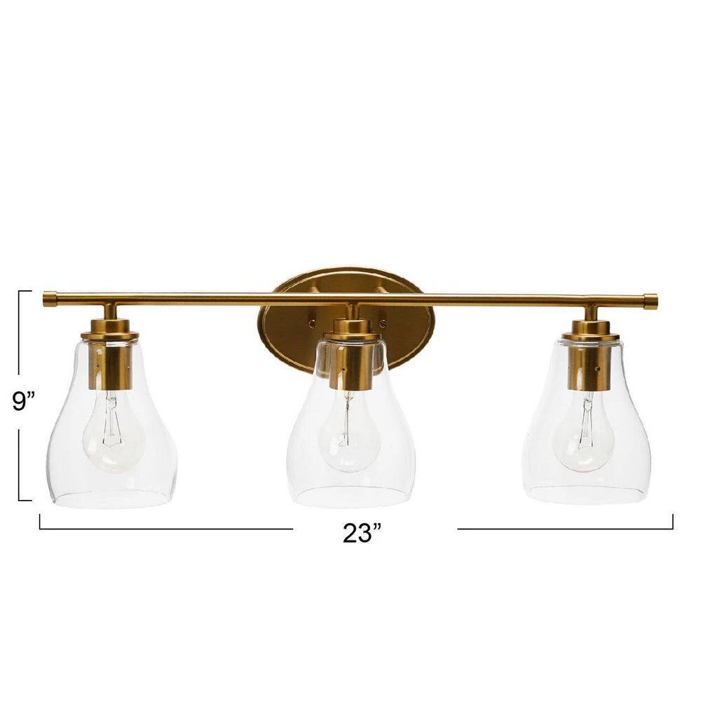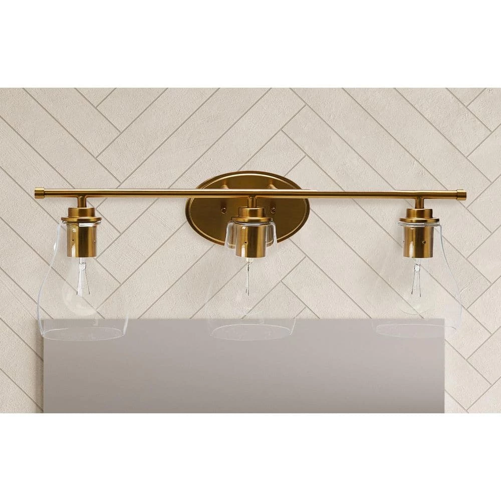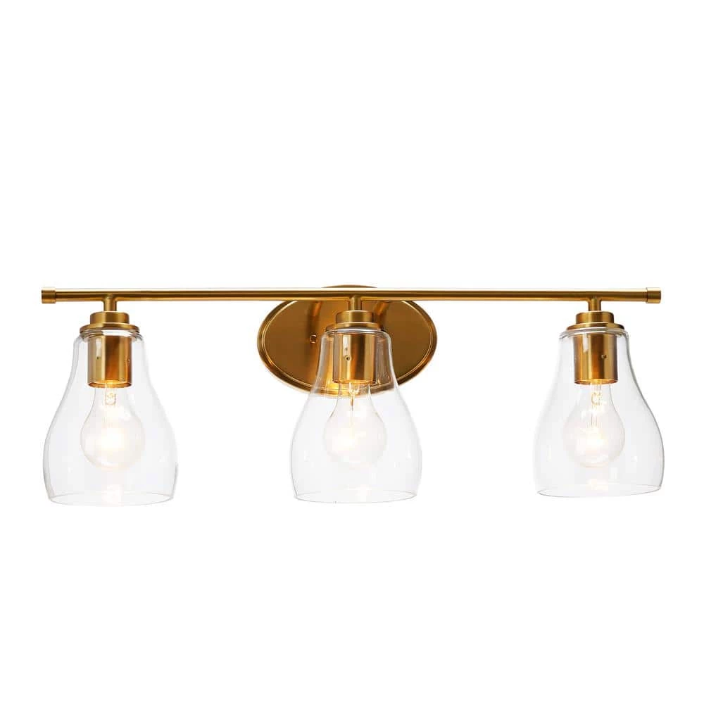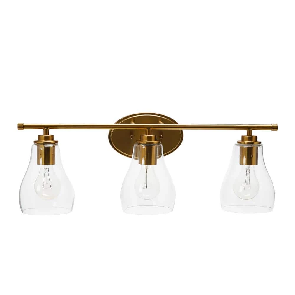 - Mid-century inspired vanity light showcases 3 clear glass diffusers captured in a sleek metal wall mount, damp location (indirect water exposure)