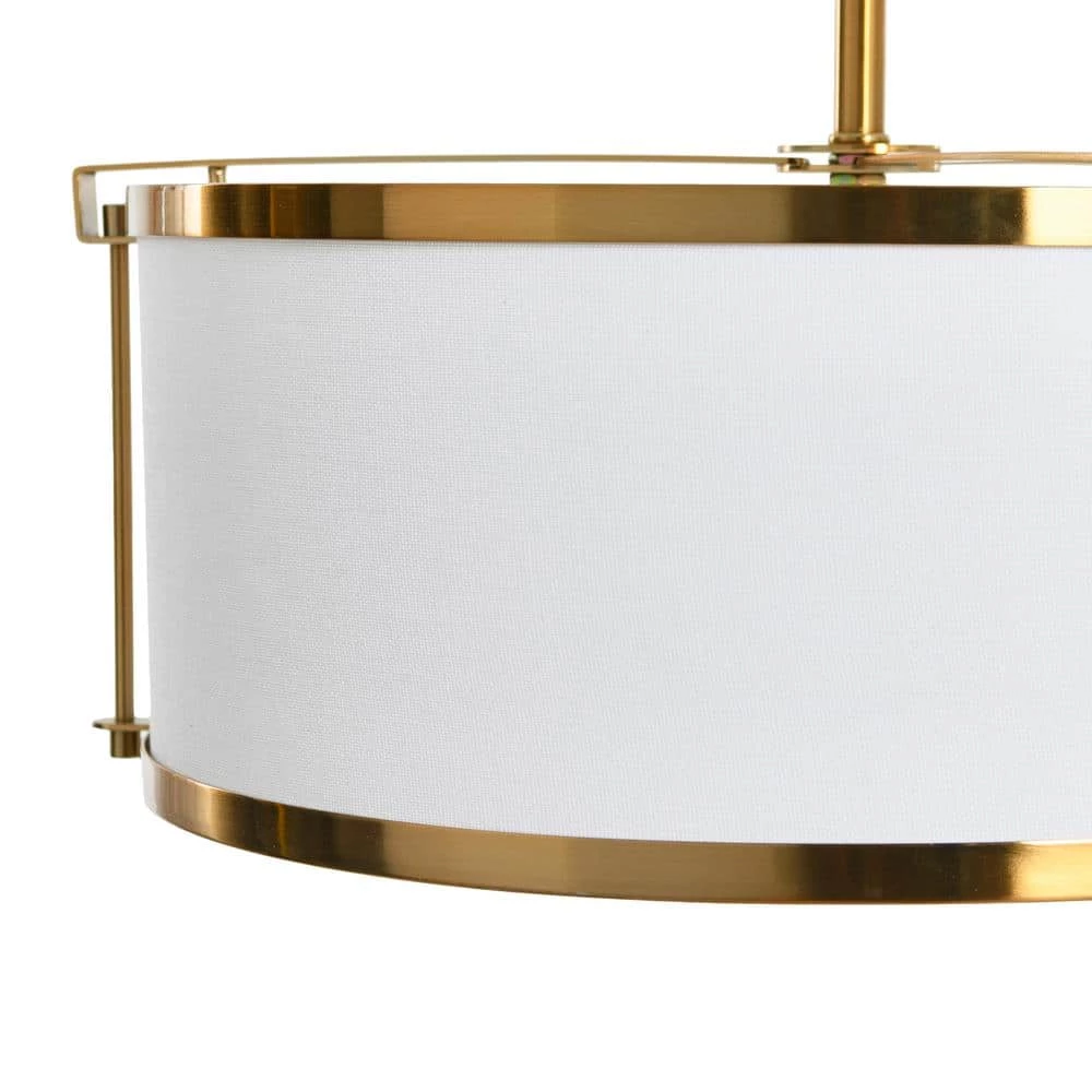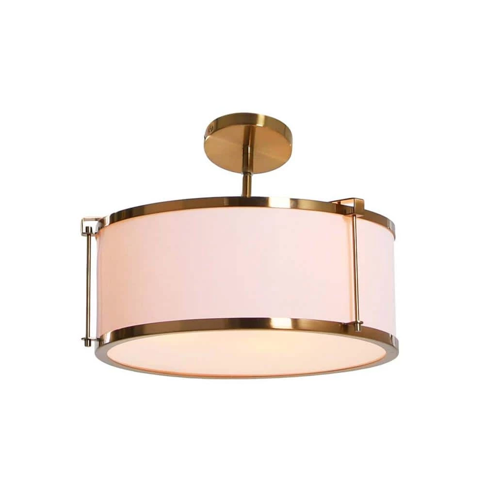 - Metal semi-flush ceiling light in a brushed brass finish with a caged linen shade
