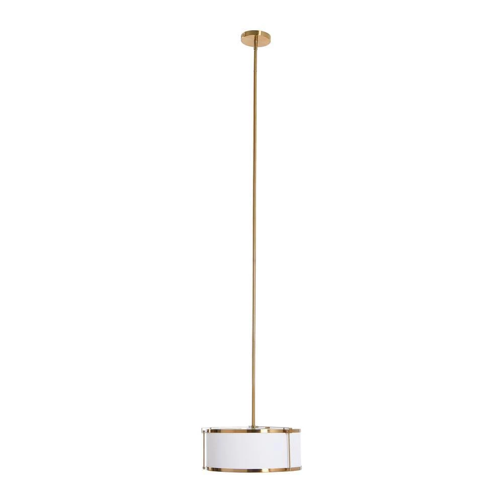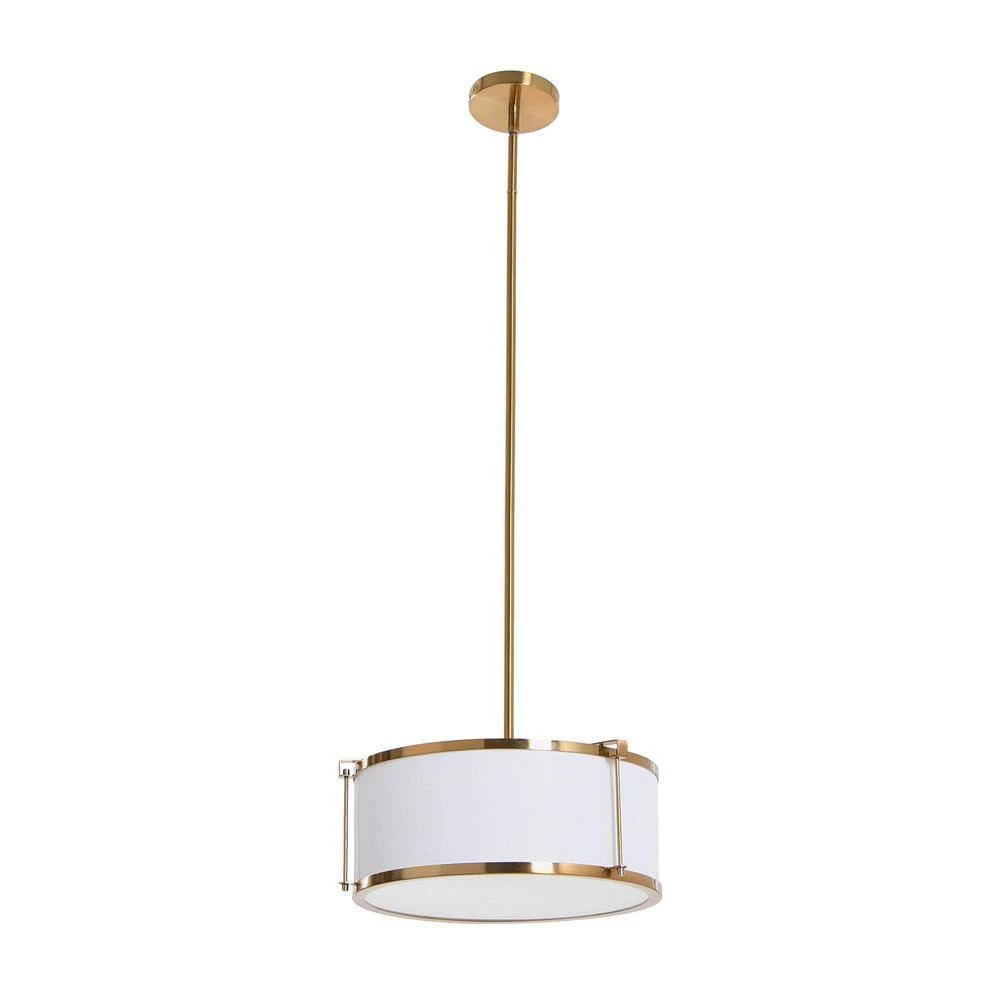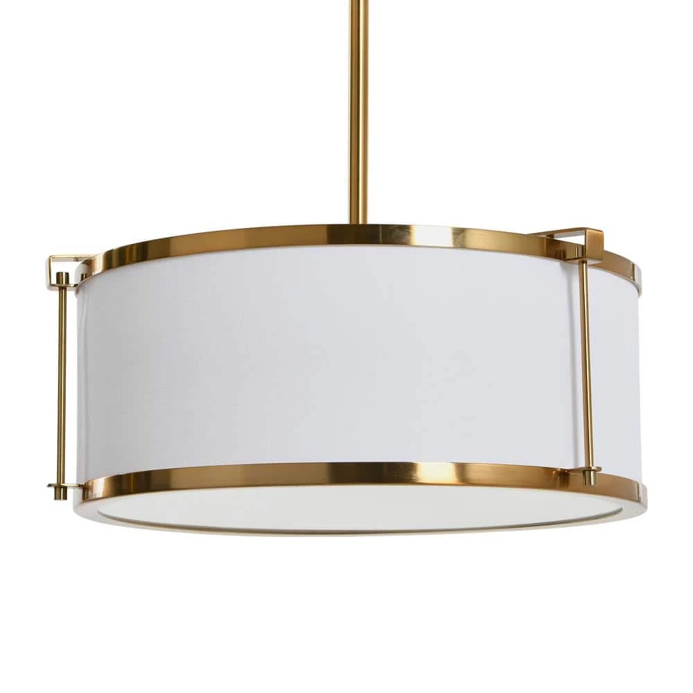 - Metal ceiling light in a brushed brass finish with a caged linen shade